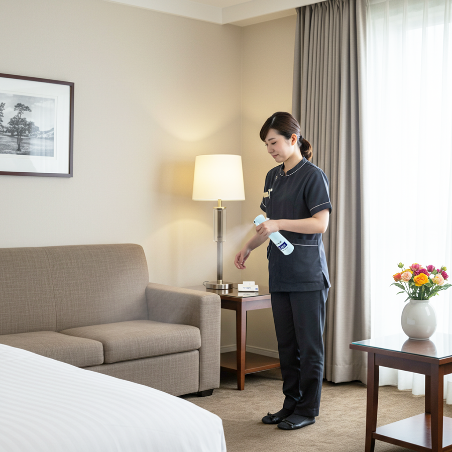 チェックアウト後の客室清掃時に消臭作業を徹底することで、次の宿泊客に快適な環境を提供できます。